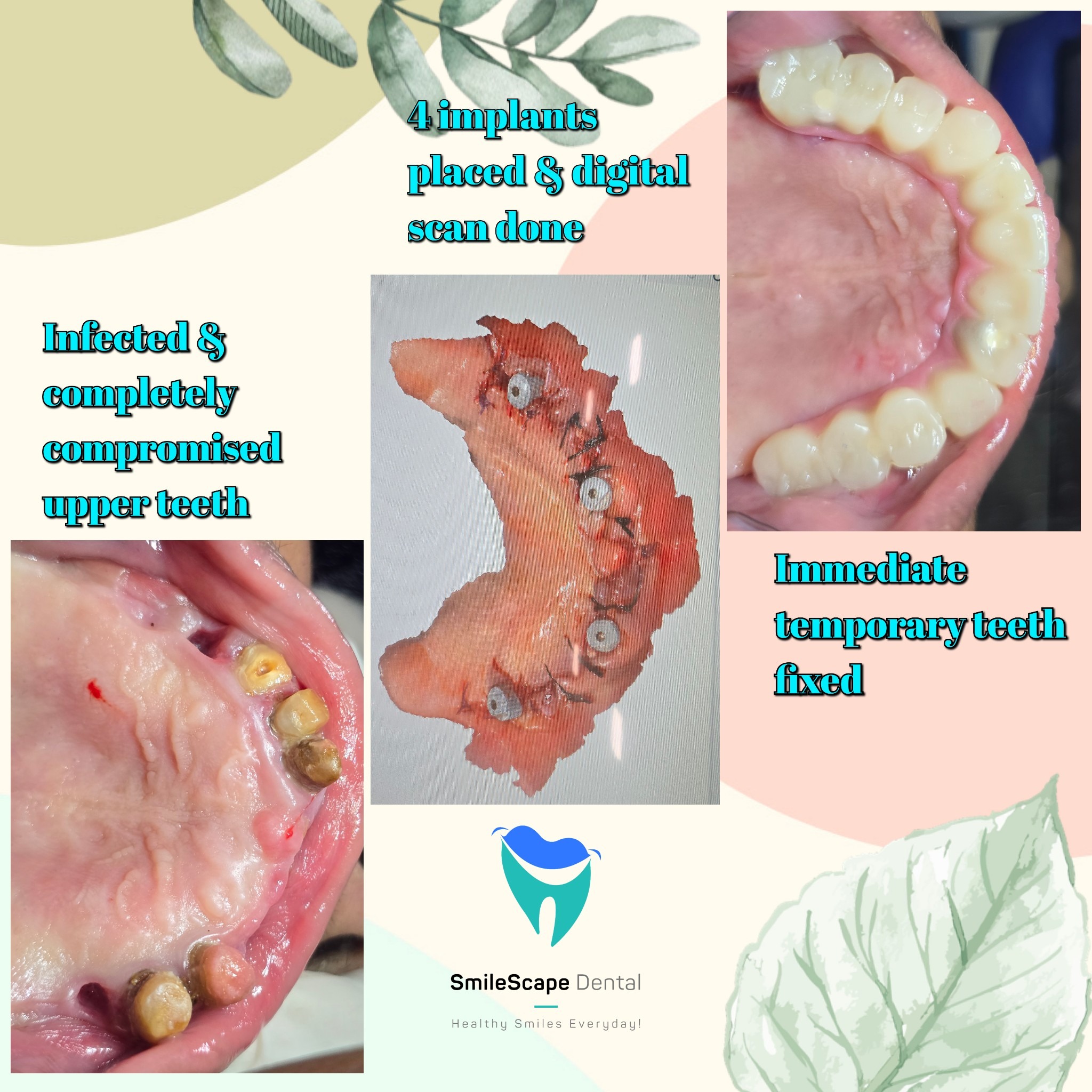 Loss of teeth due to GUM INFECTION, DECAY or TEETH FRACTURE, can be traumatising. MISSING or LOST TEETH pose severe problems like difficulty in chewing and eating, smiling confidently as well as speaking/phonetics. Over a period of time, an individual loses confidence, avoids socialising as well as affects overall health due to inadequate diet. CONVENTIONAL DENTURES are a solution to replaces few or all teeth in one or both jaws, but they are removable and they provide only about 10% chewing efficency as compared to natural fixed teeth. Also, removable dentures loosen over time due to shrinkage of the jaw bone. DENTAL IMPLANT FIXED TEETH have emerged as the best permanent solution to replace missing or broken teeth. DENTAL IMPLANTS can hold and support a single tooth or few teeth or all the teeth in one of both jaws. DENTURES can be connected to DENTAL IMPLANTS to convert them into FIXED IMPLANT-SUPPORTED DENTURES. DENTAL IMPLANTS are safe and need a one-time procedure and provide as much as 90-95% chewing efficiency, similar to natural teeth. If you suffer from any of these problems, contact us at SmileScape Dental. Our in-house Gum specialists provide expert care with utmost comfort, all under one roof.